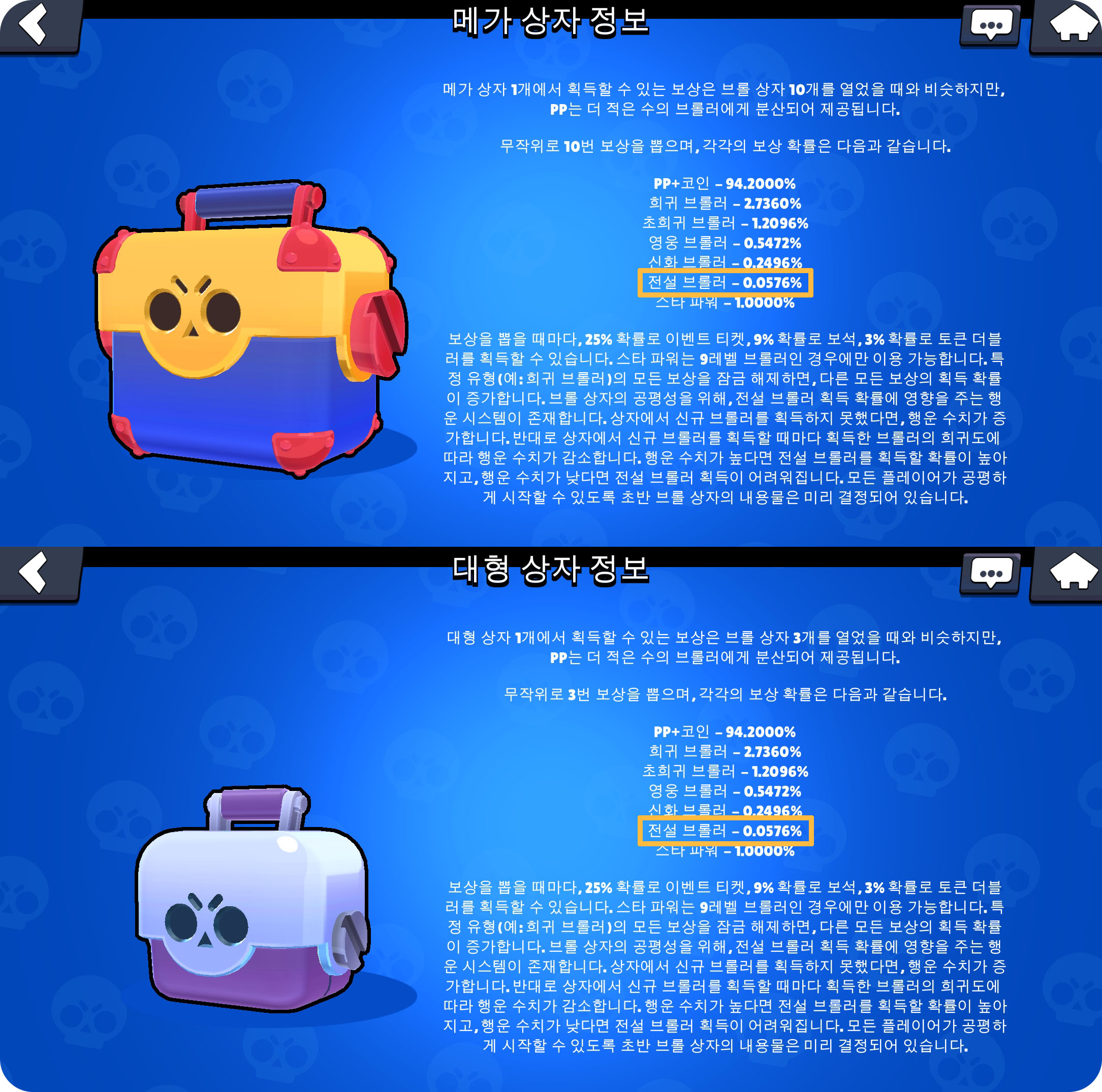 상점의 상자정보 보기로 들어가서 보시면 여러가지 확률에 관한 정보를 확인할수 있습니다.대부분90%이상의 확률로 코인이나 경험치가 나온다고 볼수있고 이후 본인 계정에 보유한 다른 브롤러에 따라 저 수치는 상대적으로 조금씩 다르다고 볼 수 있습니다.저의 경우는 전설 브롤러 빼고 모두 소유하고 있는데 제가 상자를 열어서 전설이 가질수 있는 확률은 무려 0.0576% 라는 아주 낮은수치라는걸 확인 할 수가 있습니다.이정도면 거의 포기를 해야하는 것인지 어찌해야하는건지 모르겠습니다.