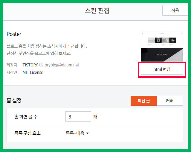 스킨 편집의 화면 오른쪽 상단의 html 편집으로 들어갈 수 있는 메뉴가 있는데요, 이쪽 편집화면으로 들어갑니다.