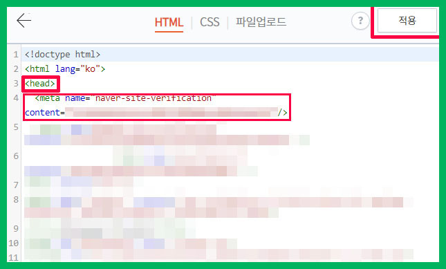 <head> 부분에서 엔터를 한 번 치고, 아까 복사한 메타태그를 붙여넣기 해주신 후 적용을 누르면 이제 소유자 확인할 수 있는 상태가 되었습니다.