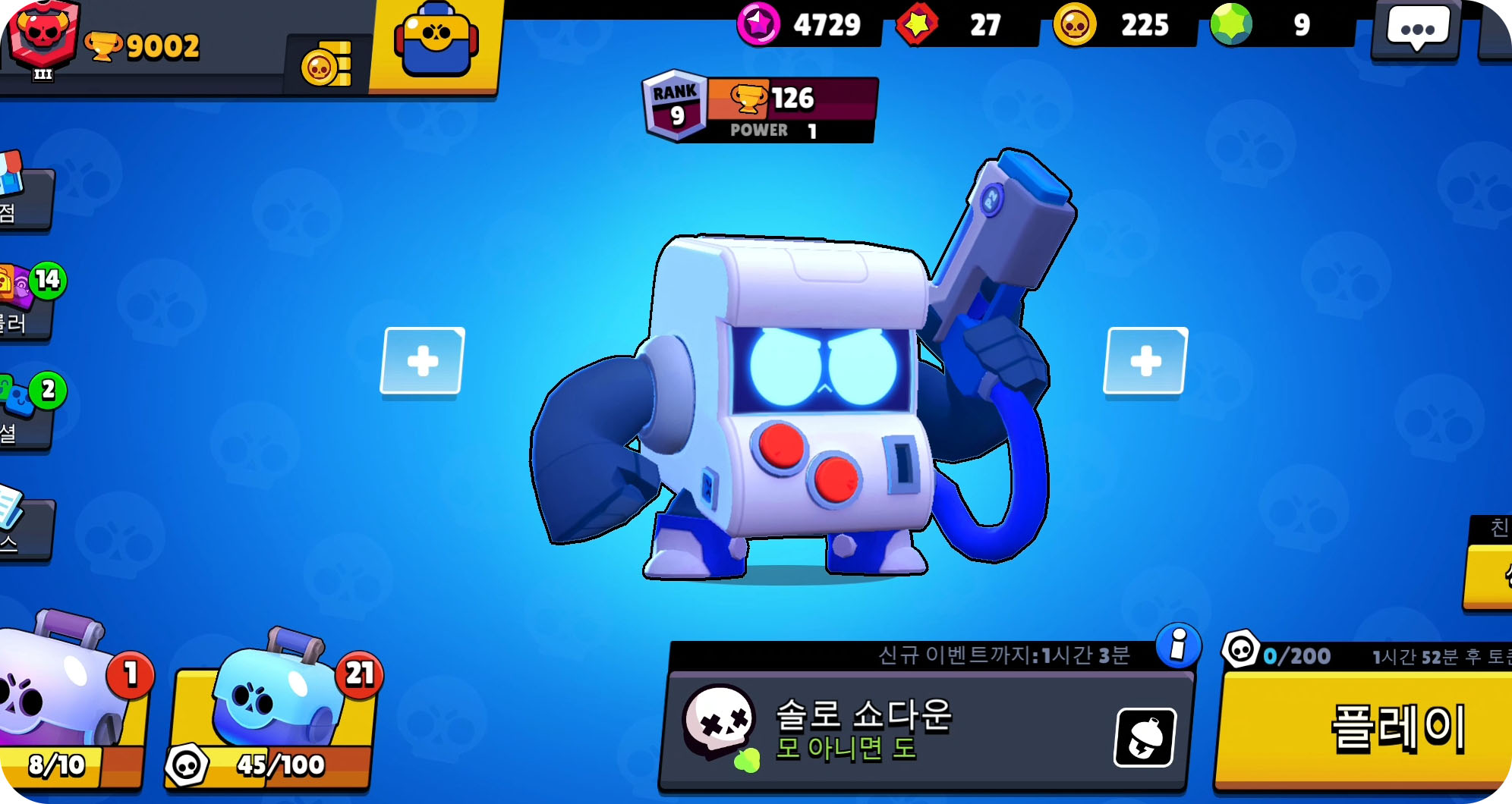 8,000개 트로피 돌파했을 때와 비슷한 상황이 나온 거 같습니다. 전설 브롤러 중 단 한 개라도 소망하였지만, 단 한 개의 전설 브롤러도 9,000개 돌파 메가박스엔 들어있지 않았네요 .가끔 특가로 보석으로 구매를 할 수 있게 상점에 나오는 경우가 있는데 보석을 모아서 사는 게 좀 더 빠르지 않을까 합니다. 근데 무과금 유저여서 보석 모으기도 여간 녹록지 않은 거 같습니다. 최근 8월 브롤스타즈 업데이트가 있었고, 신규캐릭터인 8비트가 나왔습니다. 능숙하게 하기 위해서 간간이 플레이 하고 있는데요, 멀리서 견제하면서 싸우다가 궁극기 게이지를 가득 채우고 궁극기를 이용하여 파워 업으로 승리하기 좋은거 같습니다. 8비트의 공격이 의외로 강력하여 느리다고 우습게 보다가 당하는 경우가 종종 있는듯합니다. 대신에 이동속도가 너무 느려서 조금만 방심하면 쉽게 패배하니 자리싸움과 상대방 이동 경로를 예상해서 맞춰야 승률이 높아집니다. 예상보다 컨트롤이 많이 필요한 신규 캐릭터인 8비트네요.