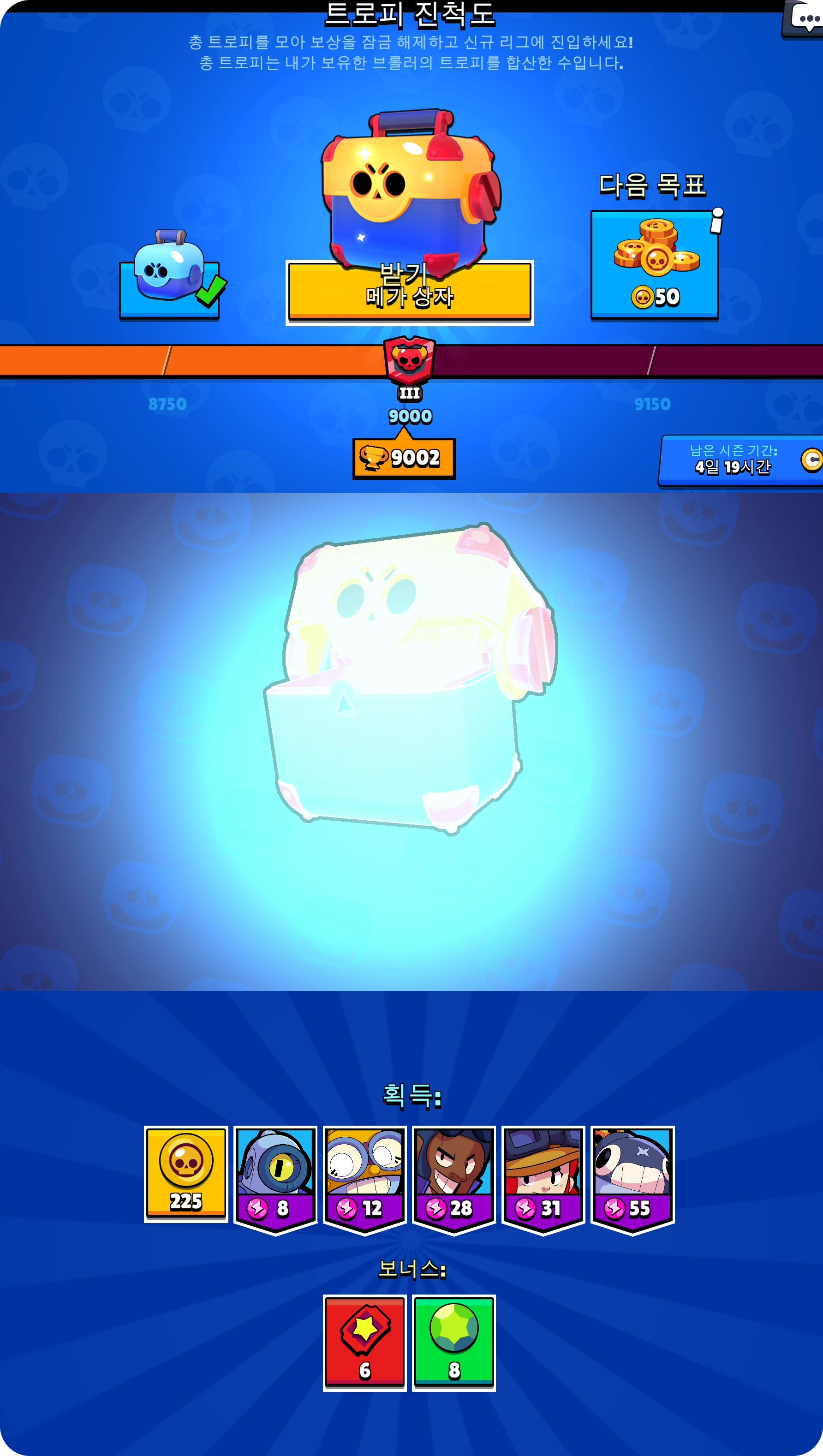 안녕하세요. 요즘도 꾸준히 브롤스타즈 트로피를 모으다 보니 어느덧 9,000개를 돌파하게 되었습니다. 처음 게임을 시작할 때는 언제 저렇게까지 모으나 싶었는데, 계속 놓지 않고 하다 보니 트로피 9,000개를 돌파하여 메가 상자를 개봉해 보게 되었네요. 아직 브롤스타즈 전설 캐릭터인 크로우, 스파이크, 레온이 없는 상태이다 보니 일반 상자든 메가 상자든 개봉할 때마다 전설 캐릭터가 하나쯤 나왔으면 하는 소망이 있습니다. 약간의 셀렘을 안고 트로피 9,000개 돌파와 동시에 메가 상자를 획득하여 개봉 해보았습니다.