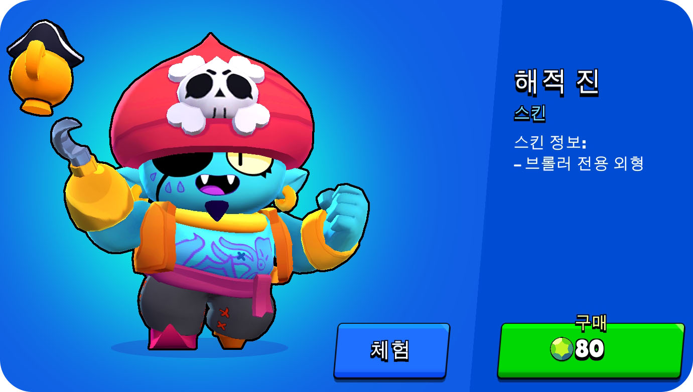 붉은 마법사 발리는 거의 색상만 교체가 된 듯하였고, 진의 새로운 스킨인 해적인이 여러 가지 디자인 변화가 많이 된 거 같았습니다. 해적이란 설정으로 제작이 되었는데요, 피터팬의 후크 선장과 비슷하게 한쪽 다리가 목발이 되었고 역시 한쪽 팔이 갈퀴가 모양으로 변하였고 에꾸 눈까지 추가하여 전형적인 해적 모습으로 스킨이 추가되었습니다. 진 옆에 같이 날아다니는 램프도 해적 모자를 착용했네요. 이상 브롤스타즈 9월 업데에서 인상적인 부분을 간략히 정리해보았습니다. 도움이 되셨다면 하트 한 번이 큰 보람이 될 거 같습니다.