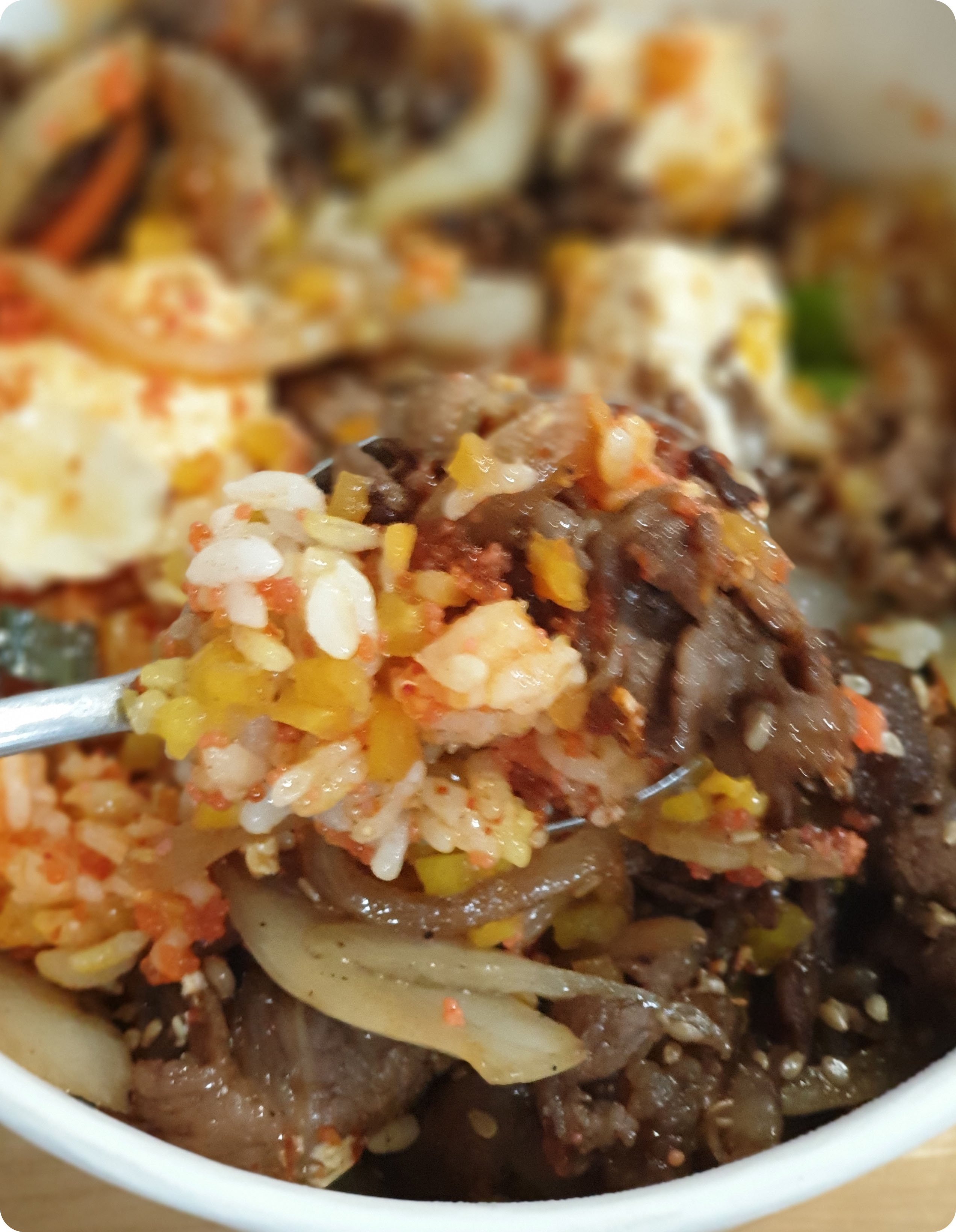 포장 뚜껑을 제거한 소공동 뚝배기 소고기 직화 알밥입니다. 알밥을 기본으로 직화로 구운 소불고기가 덮밥처럼 맨 위에 올려져 있는 상태입니다.
