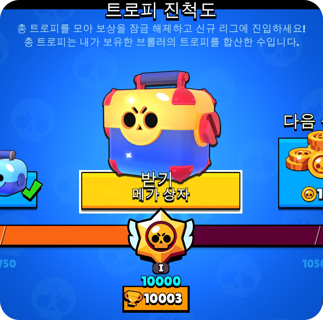 브롤스타즈 트로피 10,000개 돌파 메가 상자를 드디어 탭 하여 개봉하여 보았습니다. 이번에는 아직 소유하지 못한 전설 브롤러 중에 하나라로 나오길 기원하며 탭 하여 봅니다.