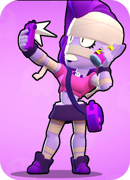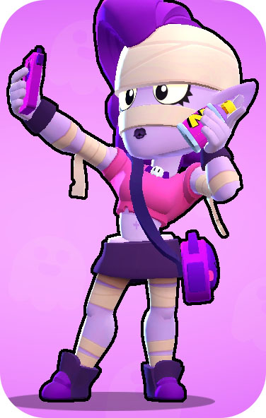 브롤스타즈 엠즈의 정면 모습 사진입니다. 전체적으로 보라색을 사용하여 통일감을 주었습니다. 설정은 여성 미라인데 보통은 몸 전체가 붕대로 감겨있는 편이지만 브롤스타즈 엠즈는 머리와 코 부분 팔뚝 부분 허벅지 종아리 등 부분적으로 붕대가 감겨있습니다.