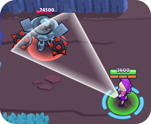 스프레이 연기로 공격하는 브롤스타즈 엠즈의 모습입니다. 엠즈의 스프레이 공격은 가까이 상대에게는 한 번에 단 한 번의 대미지만 들어갑니다. 때문에 근접전에서의 모든 공격은 효율이 좋지 않은 편입니다.