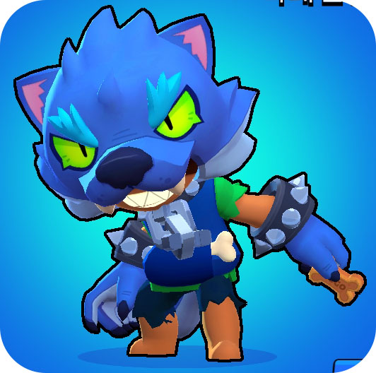 브롤스타즈 늑대인가 레온의 정면 사진 모습입니다. 선택 시 늑대 같은 포즈의 애니메이션 변화가 있습니다. 기존 기본 스킨의 레온은 후드 집업 패션으로 설정이 되었다면, 늑대 레온은 늑대의 탈 자체를 머리에 쓰고 있으며 늑대 탈 속에서 개구쟁이처럼 웃고 있는 레온이 보입니다. 양쪽 손에는 늑대의 손 같은 장갑을 끼고 있네요.
