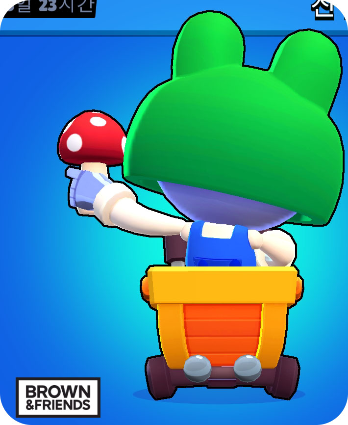 브롤스타즈 레너드 칼의 앞모습 사진입니다. 커다란 개구리 탈을 쓰고 익살스럽게 웃고 있네요. 레너드 칼의 기본 장착된 무기는 버섯이라고 합니다. 버섯을 보자마자 떠오르는 것은 역시 슈퍼 마리오네요. 마리오 같은 경우엔 버섯을 먹고 커지거나 하는 설정이지만 브롤 칼은 직접 부메랑처럼 던져서 공격하는 설정으로 제작이 되었습니다.