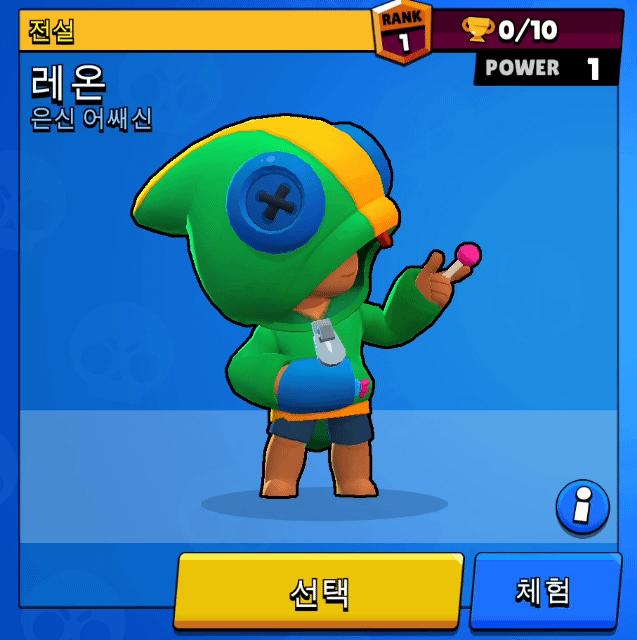 아직 플레이를 한 번도 하지 않은 랭킹 1의 트로피도 0개인 신상 레온입니다. 일반 상자 수십 개 모아서 오픈해도 나오지 않았는데, 12개 정도 모았을 때 왠지 오픈하고 싶다는 생각이 들어서 일반 상자를 다 오픈했더니 전부 다 오픈하기도 전에 레온을 얻게 되었네요.