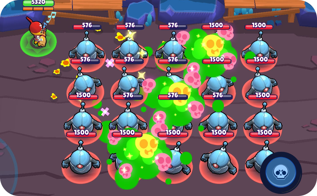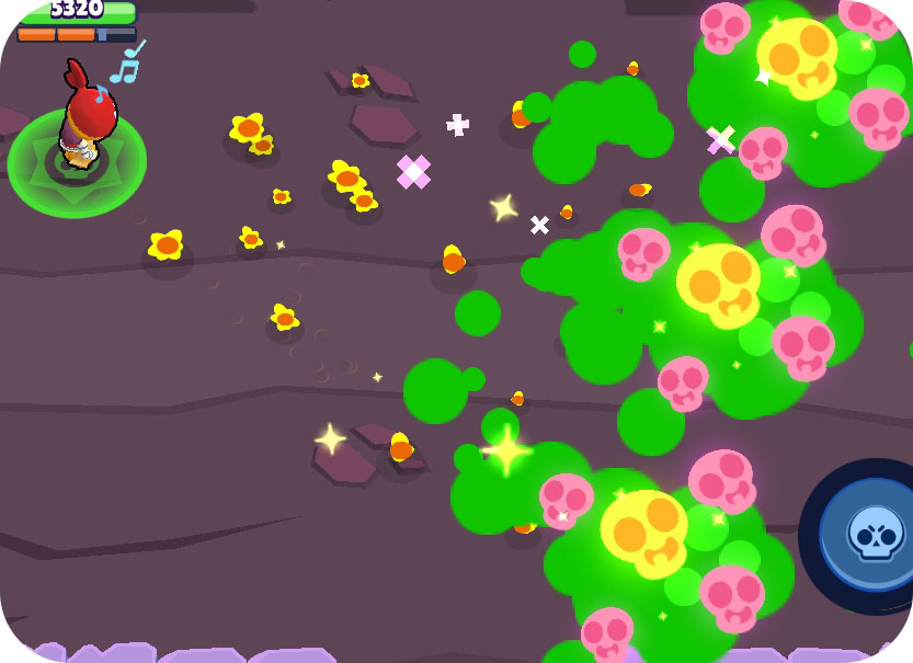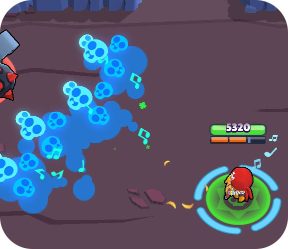 브롤스타즈 해적 포코 스킨의 게임 속 모습과 기본 공격 이펙트가 적용된 모습입니다. 기본 공격 음파 공격 시 해적포코 주변으로 빗자루의 부스러기가 떨어지고 음표 모양이 나타납니다. 음파는 해골 모양이 구름처럼 퍼지면서 나가고 마찬가지로 음표 모양이 동시에 나타나게 되는 전용 이펙트가 생기네요.