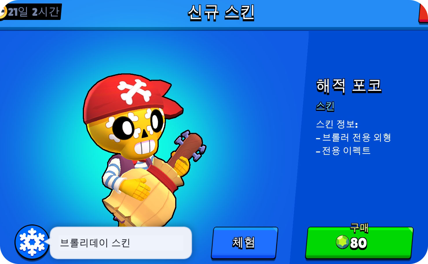 안녕하세요. 브롤스타즈 이번 12월 업데이트로 신규 스킨과 새로운 맵이 등장했는데요, 그중 포코의 신규 스킨인 해적 포코에 대해서 알아보도록 하겠습니다. 12월 업데이트에선 해적과 관련된 설정으로 방향을 잡은 거 같습니다. 신규 스킨부터 새로운 맵까지 전부 해적과 연관 있는 설정이 이루어진 듯합니다.
