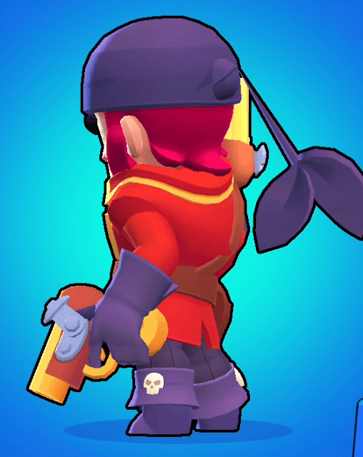 브롤스타즈 해적 콜트 스킨의 옆모습과 전체적인 모습을 볼 수 있는 회전 움짤입니다. 가장 특이한 건 머리의 두건인데, 두건의 매듭 부분이 길게 꼬리처럼 디자인되어 마무리되었네요. 꼬리 같은 매듭 부분에는 애니메이션이 적용되지 않아 뭔가 딱딱한 느낌입니다.