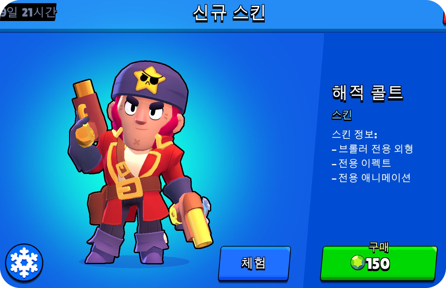 안녕하세요. 브롤스타즈 12월 업데이트로 콜트의 신큐 스킨이 공개가 되었습니다. 서부의 카우보이처럼 쌍권총을 무기로 사용하는 콜트인데요, 이번 브롤스타즈 12월 업데이트로 새롭게 해적 콜트 스킨이 추가가 되었습니다. 상점에서 보석 150 개로 구매가 가능한 상태인데요, 전용 이펙트, 전용 외형, 전용 애니메이션 등이 해적콜트 스킨에 추가가 되었습니다. 지금부터 해적 콜트 스킨에 대해 알아볼게요.
