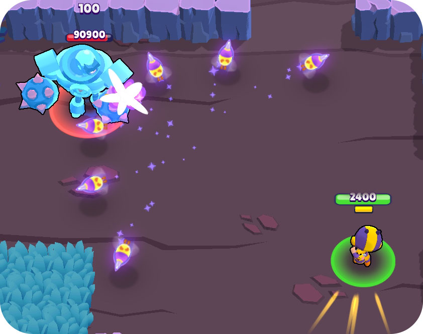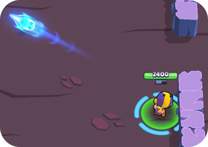 브롤스타즈 비의 게임 속 기본 공격 모습입니다. 비는 저격수의 설정으로 기존의 칼과 동일하게 한 개의 탄창으로 플레이를 합니다. 비의 기본 공격은 사진처럼 푸른색의 거대 벌침을 발사하는데요, 레벨 1 기준 비의 첫 번째 공격 대미지는 800이지만, 첫 번째 공격이 명중 후 두 번째 공격의 대미지는 2200으로 큰 피해를 줍니다. 비의 첫 번째 공격을 맞았다면 두 번째 공격을 맞지 않도록 주의하며 플레이해 주세요.